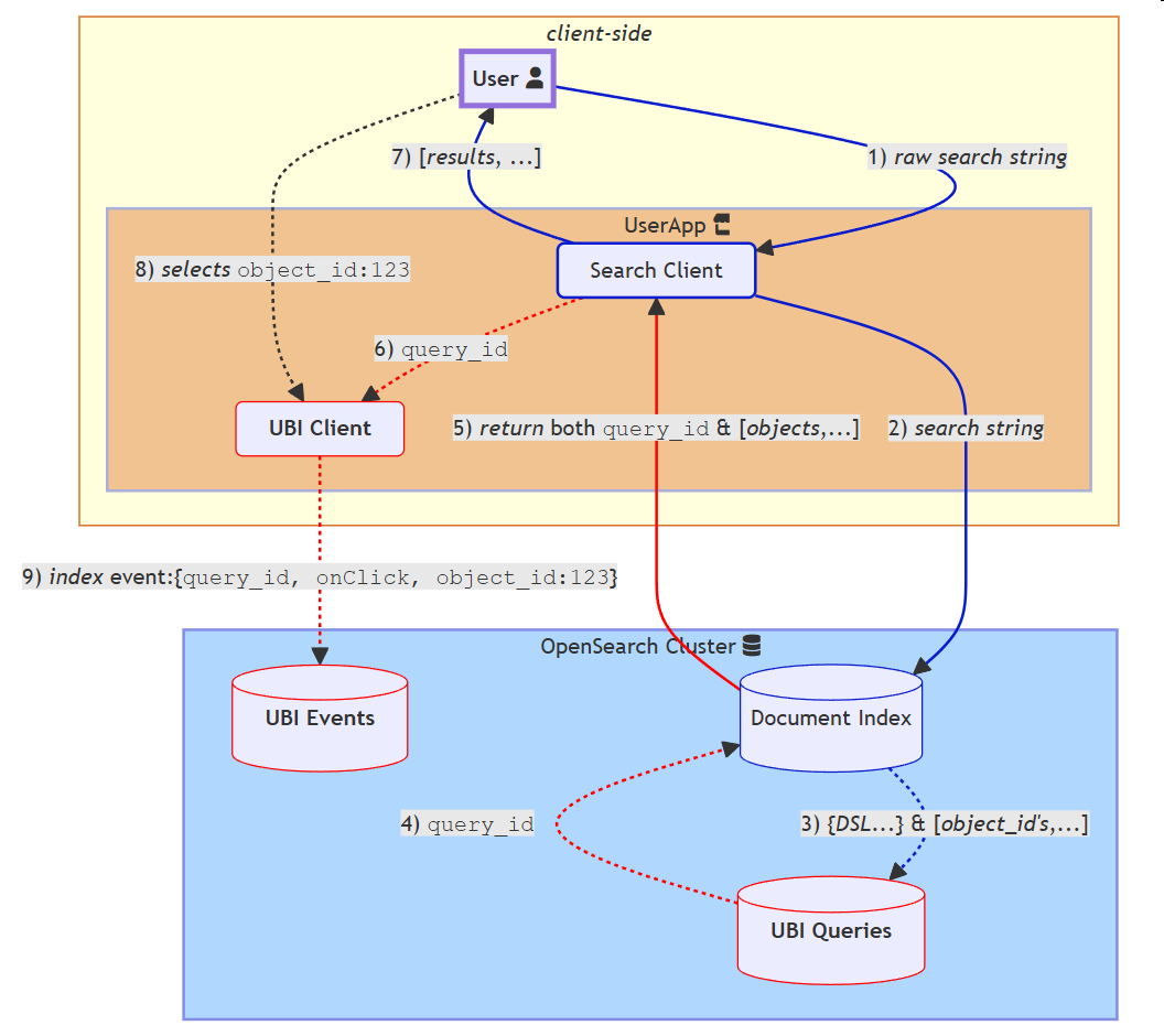 query_idto the UBI client. Even though the search and UBI event indexing roles are separate in this diagram, many implementations can use the same SmartObserve client instance for both roles (6 in the preceding diagram). - The UBI client then indexes all user events with the specified